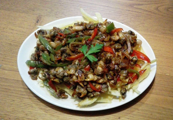 Un plato típico de Cariño son los Berberechos fritos o a la Cariñesa, hechos con pimiento y cebolla sobre una cama de patata frita.